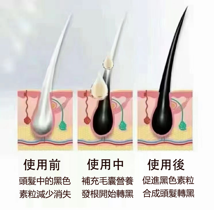 1、快速黑髮: 5-7天黑髮根開始,30天長出黑髮,50天滿頭黑髮,一茬一茬往外拱!