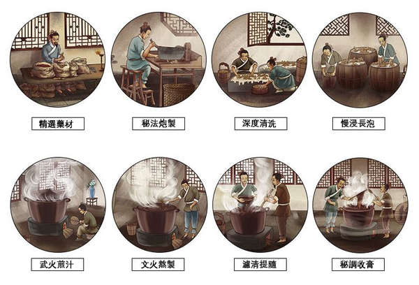 整個製作過程非常繁複、嚴格,必須選用道地的七味補益肝腎、調節五臟的藥材,獨家的17道工序才能炮製好——
